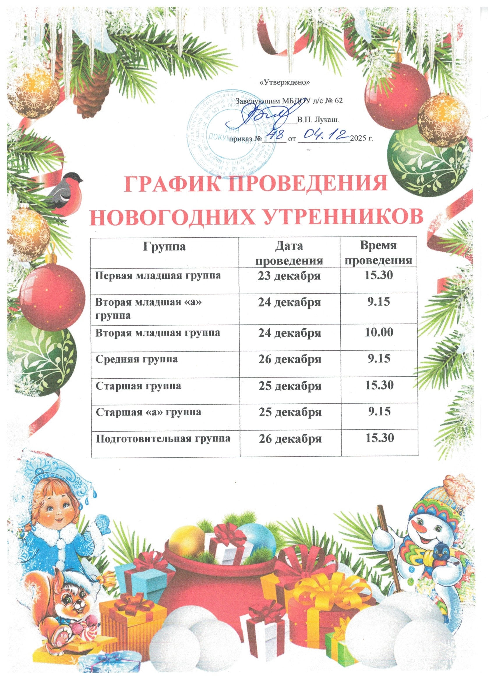 График проведения новогодних утренников в МБДОУ детском саду №62